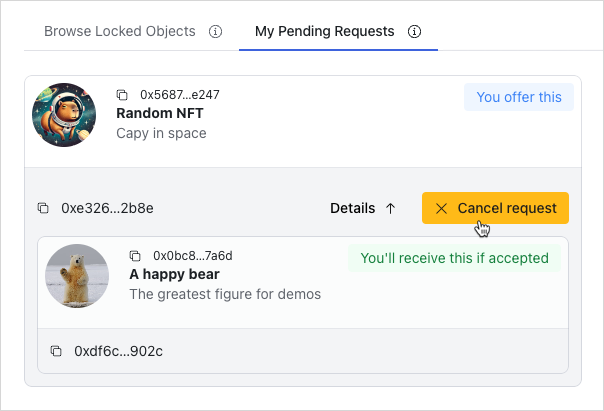 My Pending Requeststab in theEscrowspage. - Cancel an escrow that you requested.